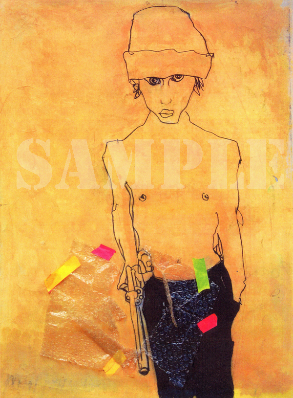 MY NEW GUN (From the MEAN STREETS Series watercolor / pencil / tape & bubblewrap 20 lb. bond paper 30" X 40" by Dino Danelli - Please allow three to four weeks delivery